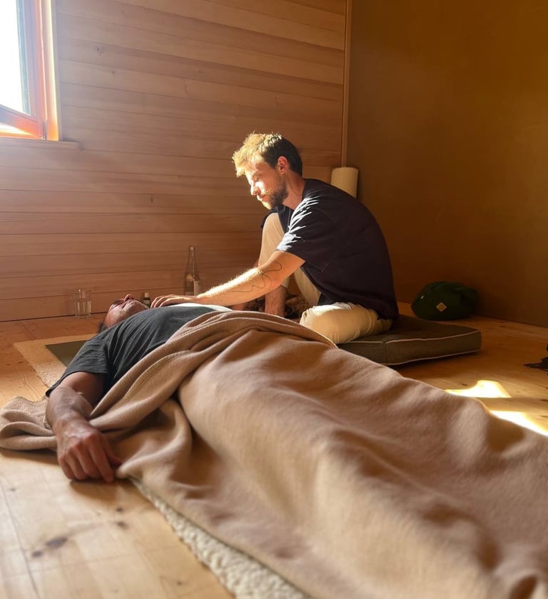 Dann begleite ich dich sanft in die bewusste, verbundene Atmung. Es läuft Musik, und wir gehen mit dem, was Moment für Moment auftaucht.
